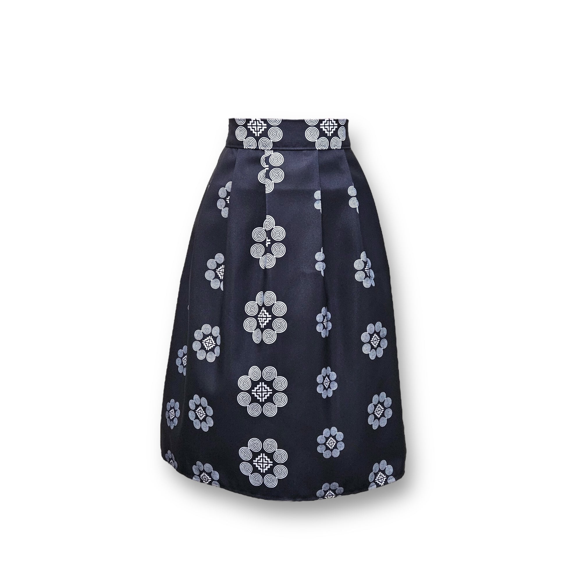 New Hmong print pleated skirt. Featuring a smooth front and an elastic waistband in the back, making it both comfortable and flattering for all body types. Knife-pleated with the ideal level of puffiness for a stylish silhouette. This design creates the illusion of a smaller waist, allowing for effortless dressing up or down--perfect for everyday wear. Made from wrinkle-resistant polyester, this skirt is machine washable in cold water and can be tumble dried on low heat. Made in USA--your versatile wardrobe essential!