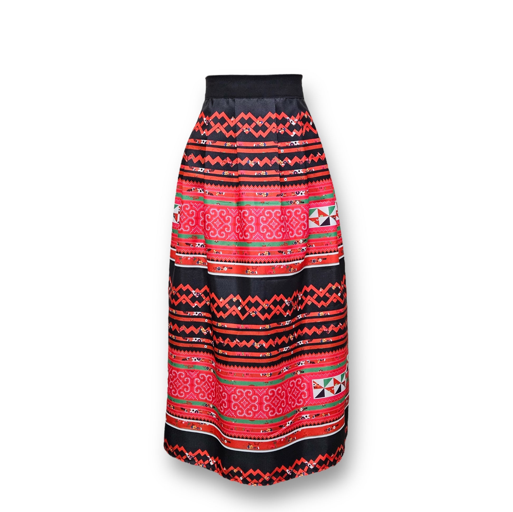 New Hmong print pleated skirt. Featuring a smooth front and an elastic waistband in the back, making it both comfortable and flattering for all body types. Knife-pleated with the ideal level of puffiness for a stylish silhouette. This design creates the illusion of a smaller waist, allowing for effortless dressing up or down--perfect for everyday wear. Made from wrinkle-resistant polyester, this skirt is machine washable in cold water and can be tumble dried on low heat. Made in USA--your versatile wardrobe essential!