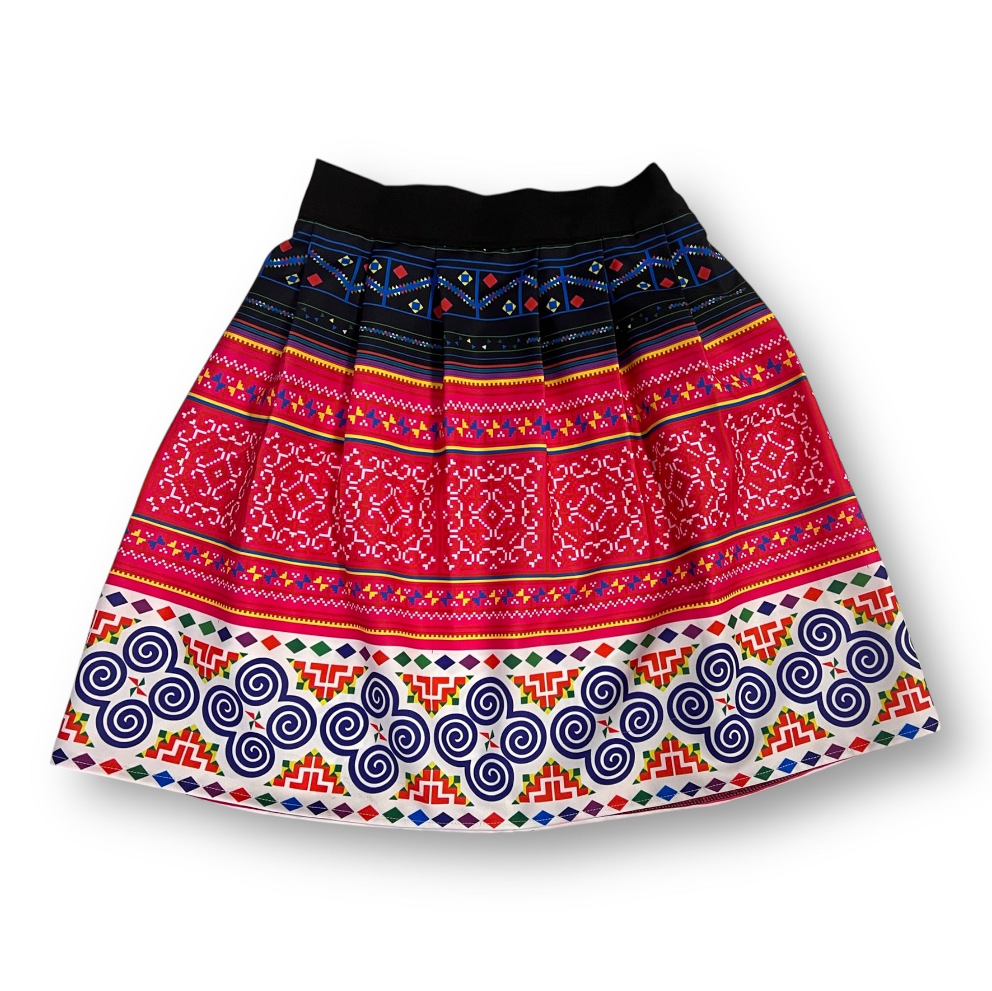 New Hmong print pleated skirt. Featuring a smooth front and an elastic waistband in the back, making it both comfortable and flattering for all body types. Knife-pleated with the ideal level of puffiness for a stylish silhouette. This design creates the illusion of a smaller waist, allowing for effortless dressing up or down--perfect for everyday wear. Made from wrinkle-resistant polyester, this skirt is machine washable in cold water and can be tumble dried on low heat. Made in USA--your versatile wardrobe essential!