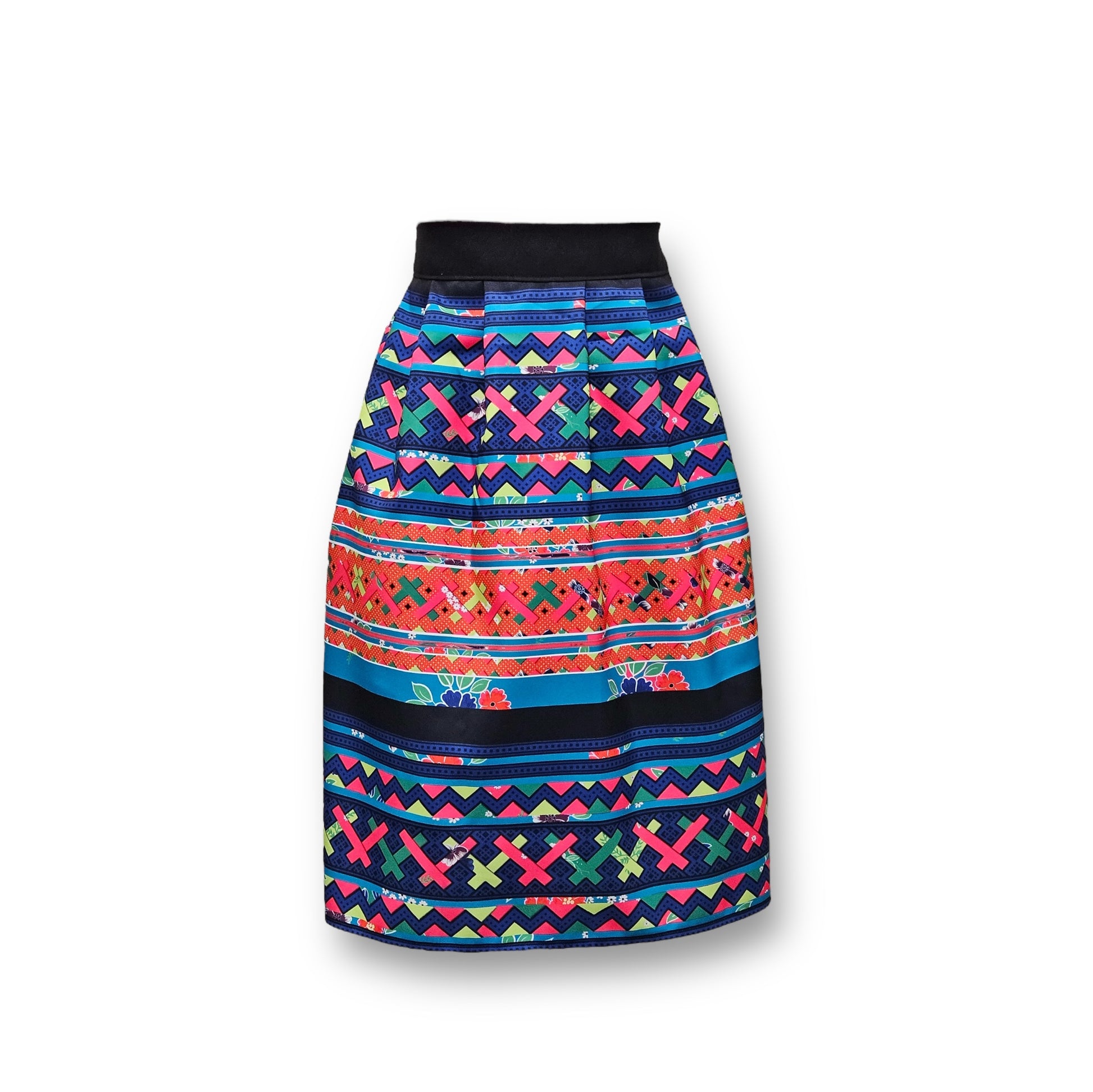 New Hmong print pleated skirt. Featuring a smooth front and an elastic waistband in the back, making it both comfortable and flattering for all body types. Knife-pleated with the ideal level of puffiness for a stylish silhouette. This design creates the illusion of a smaller waist, allowing for effortless dressing up or down--perfect for everyday wear. Made from wrinkle-resistant polyester, this skirt is machine washable in cold water and can be tumble dried on low heat. Made in USA--your versatile wardrobe essential!