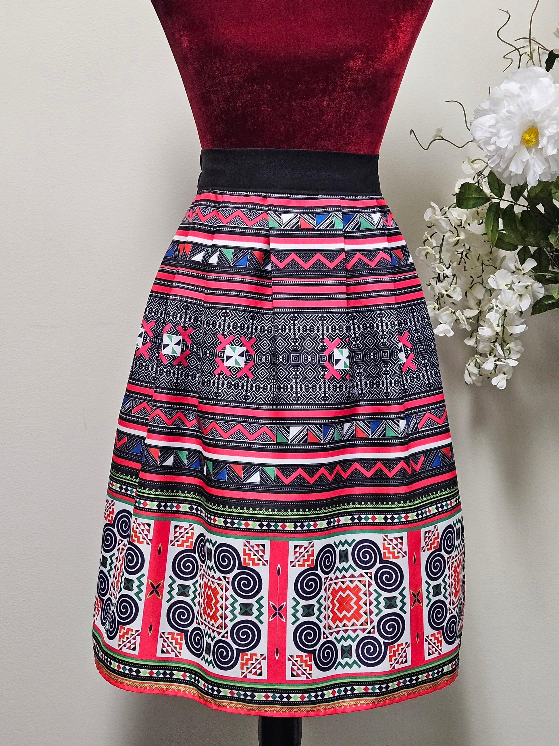 New Hmong print pleated skirt. Featuring a smooth front and an elastic waistband in the back, making it both comfortable and flattering for all body types. Knife-pleated with the ideal level of puffiness for a stylish silhouette. This design creates the illusion of a smaller waist, allowing for effortless dressing up or down--perfect for everyday wear. Made from wrinkle-resistant polyester, this skirt is machine washable in cold water and can be tumble dried on low heat. Made in USA--your versatile wardrobe essential!