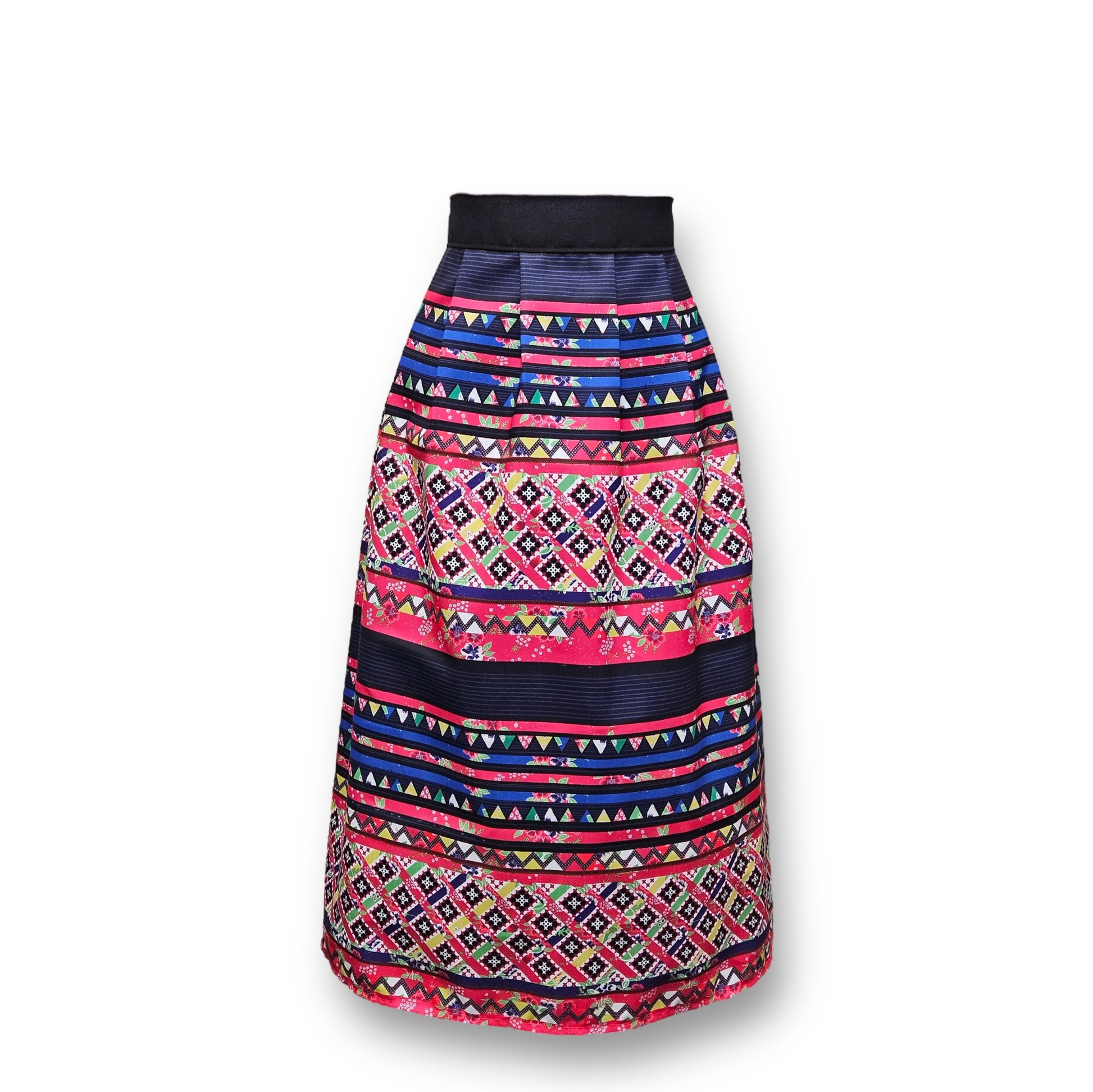 New Hmong print pleated skirt. Featuring a smooth front and an elastic waistband in the back, making it both comfortable and flattering for all body types. Knife-pleated with the ideal level of puffiness for a stylish silhouette. This design creates the illusion of a smaller waist, allowing for effortless dressing up or down--perfect for everyday wear. Made from wrinkle-resistant polyester, this skirt is machine washable in cold water and can be tumble dried on low heat. Made in USA--your versatile wardrobe essential!