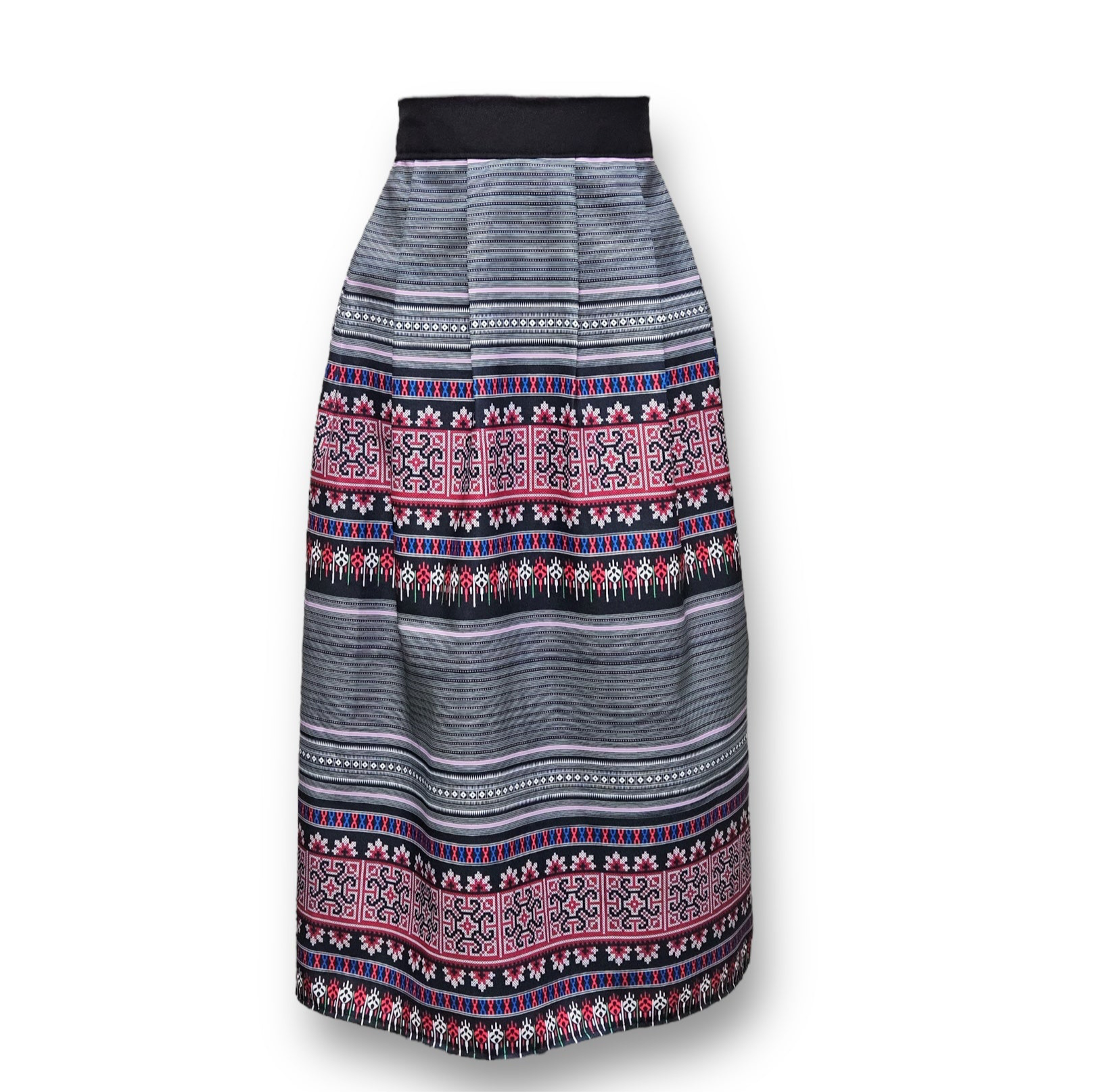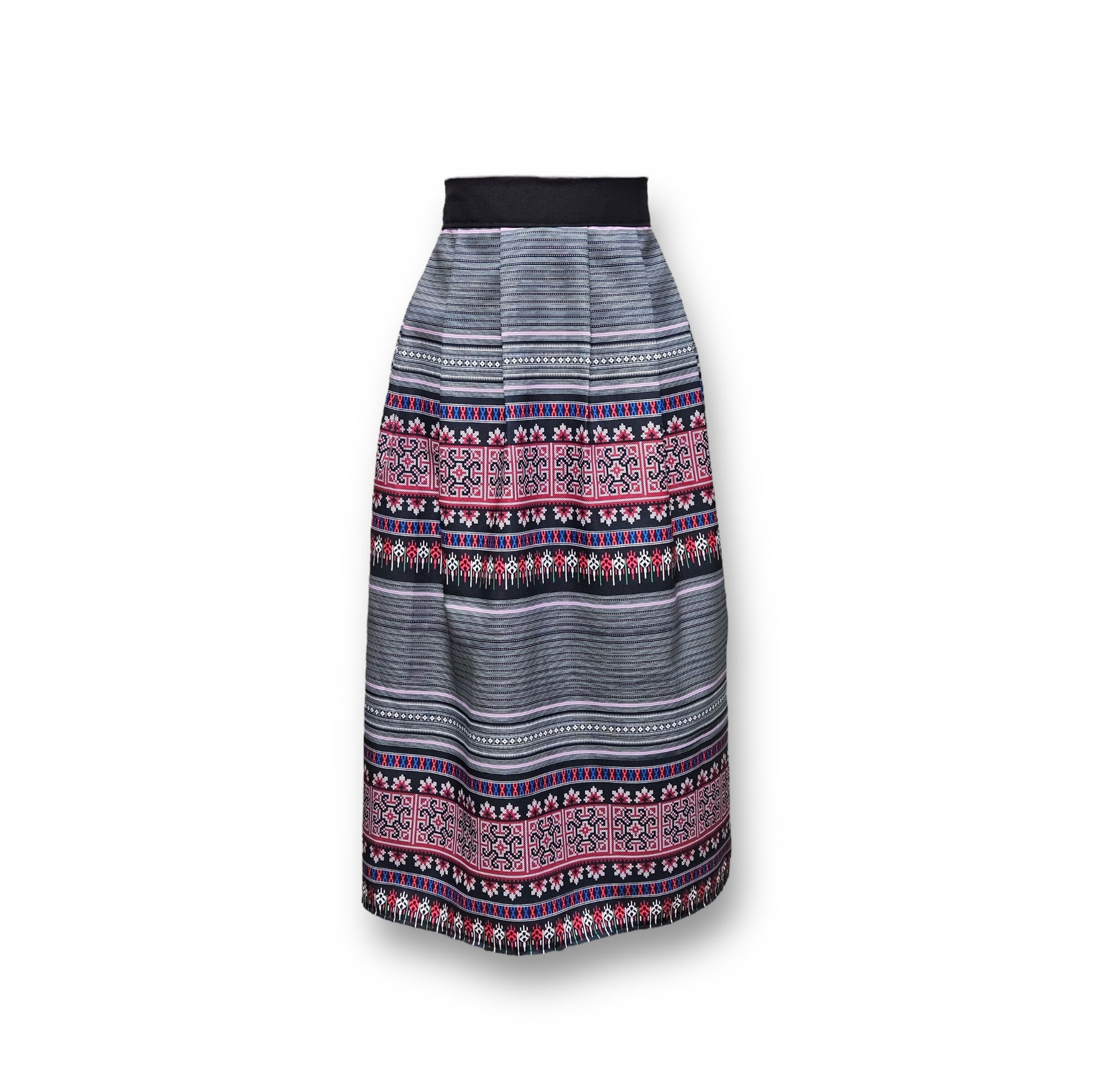New Hmong print pleated skirt. Featuring a smooth front and an elastic waistband in the back, making it both comfortable and flattering for all body types. Knife-pleated with the ideal level of puffiness for a stylish silhouette. This design creates the illusion of a smaller waist, allowing for effortless dressing up or down--perfect for everyday wear. Made from wrinkle-resistant polyester, this skirt is machine washable in cold water and can be tumble dried on low heat. Made in USA--your versatile wardrobe essential!