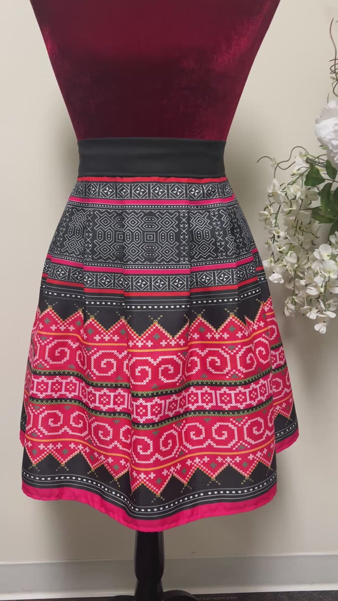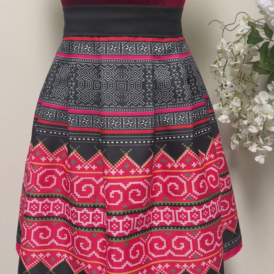 New Hmong print pleated skirt. Featuring a smooth front and an elastic waistband in the back, making it both comfortable and flattering for all body types. Knife-pleated with the ideal level of puffiness for a stylish silhouette. This design creates the illusion of a smaller waist, allowing for effortless dressing up or down--perfect for everyday wear. Made from wrinkle-resistant polyester, this skirt is machine washable in cold water and can be tumble dried on low heat. Made in USA--your versatile wardrobe essential!
